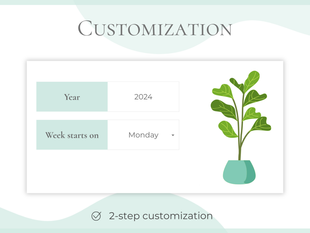 ✤ Customization tab – Quick two-step setup: enter the year and your preferred week start, and you’re all set!