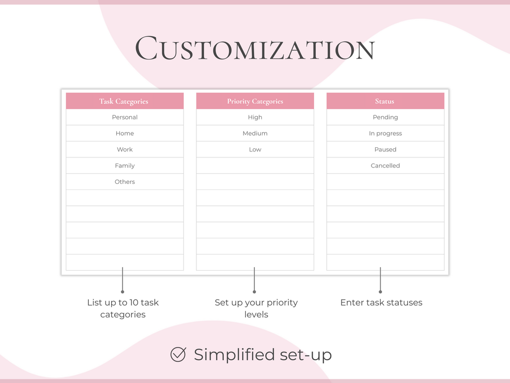 ✤ Customization tab – Tailor priorities, task categories, and status options to suit your needs.