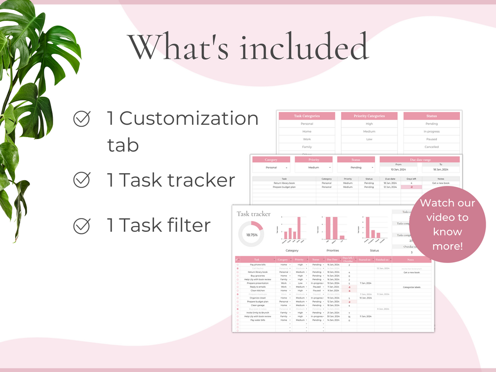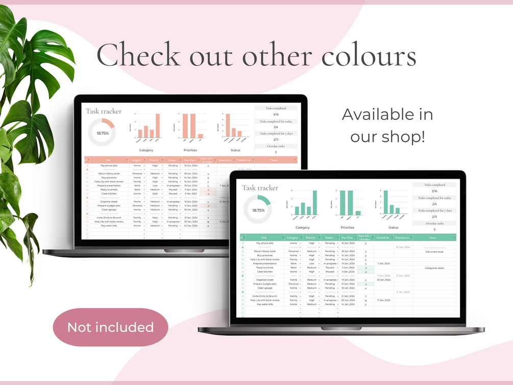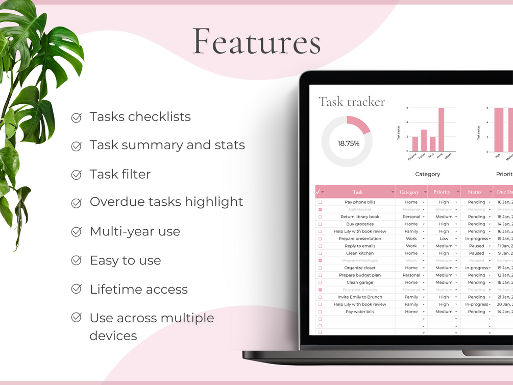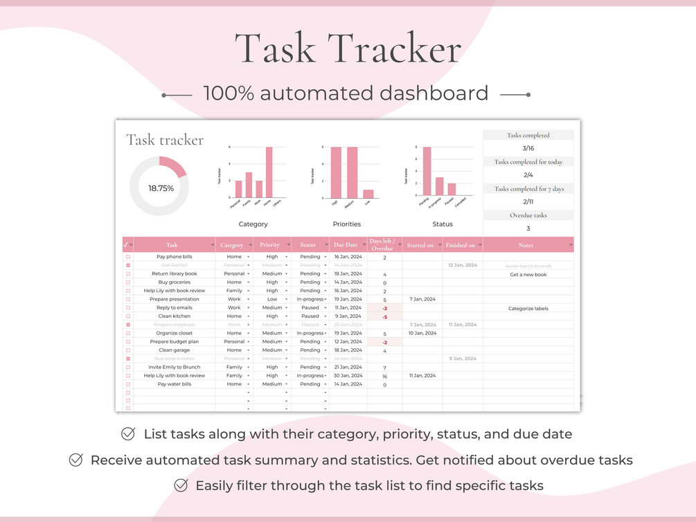 ✤ Task tracker – Organize and track tasks by priority, category, due date, and status. Mark tasks as complete and get auto-generated summaries and charts for a clear overview.