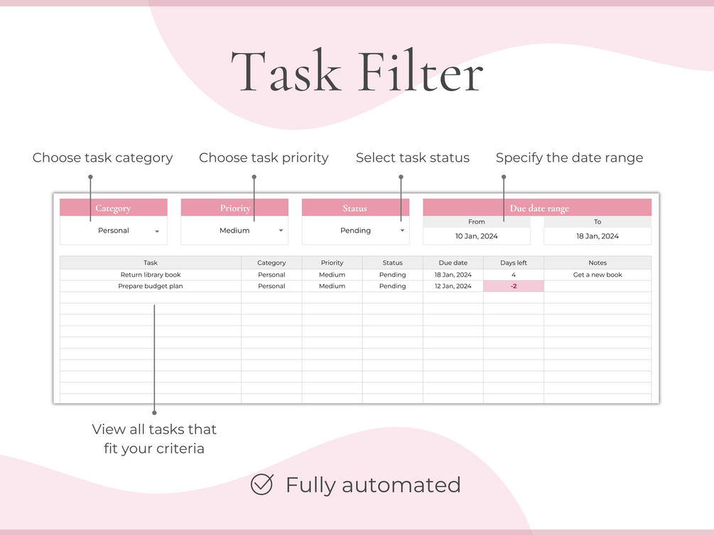 ✤ In-built filter – Locate specific tasks with the easy-to-use filtering system.