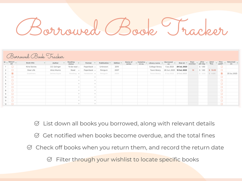 ✤ Borrowed Book Tracker – Monitor borrowed books, due dates, and any related library fines.