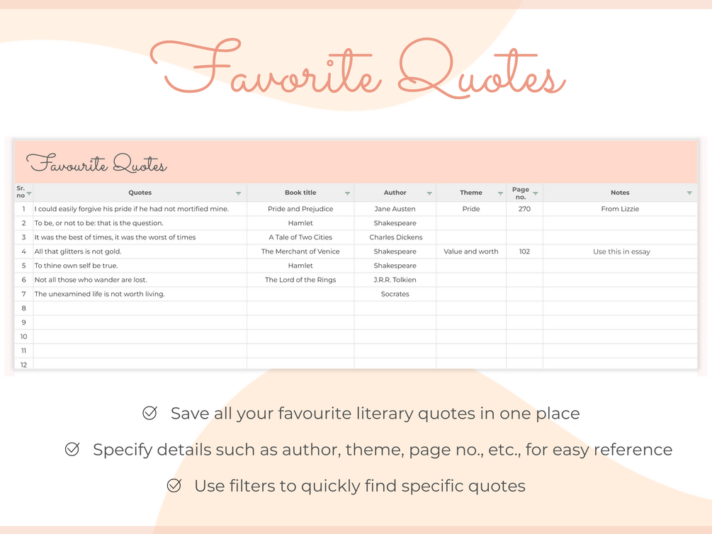 Dive into your literary world with our reading tracker! This innovative tool allows you to catalogue and track the minutest detail of every book in your library, helping you categorize your collection with ease. Capture your favourite quotes, manage wishlists, and keep tabs on borrowed books.